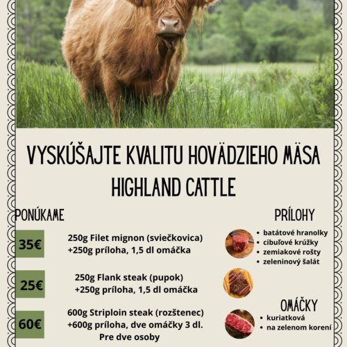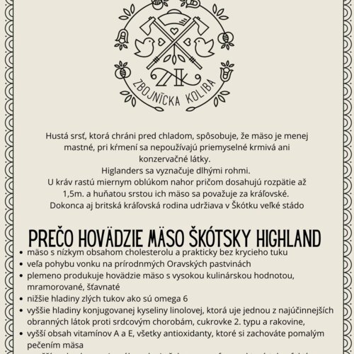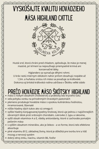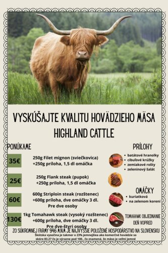 Toto mäso má nízky obsah cholesterolu a je prakticky bez krycieho tuku. Hustá srsť, ktorá chráni pred chladom, spôsobuje, že mäso je menej mastné, pri kŕmení sa nepoužívajú priemyselné krmivá ani konzervačné látky. Highlanders sa vyznačuje dlhými rohmi. U kráv rastú miernym oblúkom nahor pričom dosahujú rozpätie až 1,5m a huňatou srsťou ich mäso sa považuje za kráľovské. Dokonca aj britská kráľovská rodina udržiava v Škótsku veľké stádo.